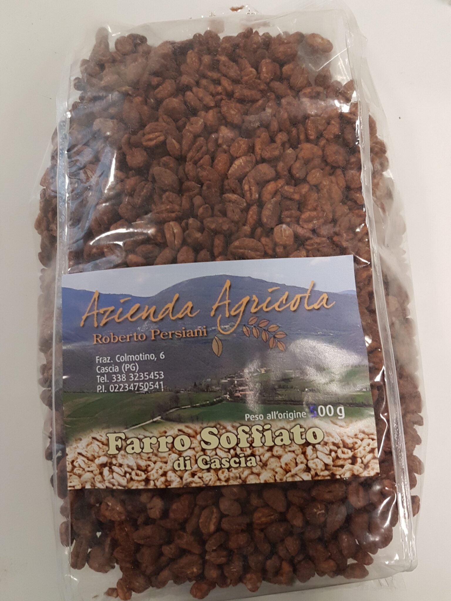 Il Farro Soffiato al Cioccolato Azienda Agricola Persiani sono in formato da 125 gr e sono confezionati in un sacchetto trasparente.