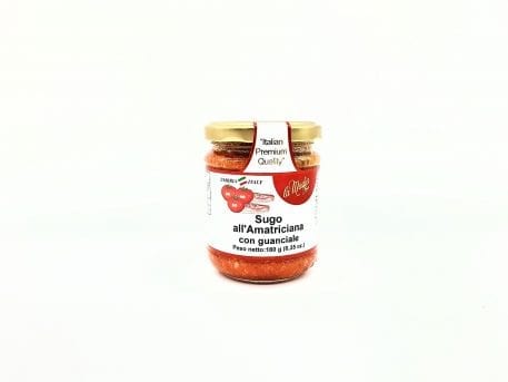 Il Sugo all’Amatriciana con Guanciale peso 180g è un ottimo prodotto per condire la pasta, il Sugo all’Amatriciana con Guanciale ha peso 180 ged è confezionato in barattolo di vetro.